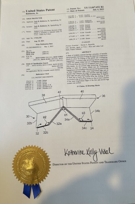 The patented construction of Tuff Angle edge protectors give them a combination of characteristics that traditional edge protectors simply cannot match. Tuff Angle edge protectors are made from corrugated sheets that are scored, glued, folded, and held in a ninety degree shape until dry. They are nested for shipment and arrive at the customer preformed and ready to use. The scoring and folding is like a trifold wallet. All three layers, once glued, are bent one more time into a ninety-degree angle. This patented folding design gives tremendous strength to the corner of the protector, one of the most critical areas for product damage. This is a significantly different process than is used to make traditional corner boards. Most edge protectors are formed simply by layering flat or fluted paper until a desired thickness is created, and then plunging the layers into a V shape.